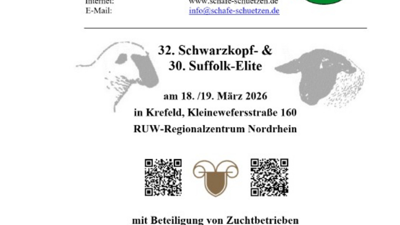 Rheinland-pfälzische Angebote zur 32. Schwarzkopf- und 30. Suffolk-Eliteauktion am 18./19. März 2026 in Krefeld, Kleinewefersstraße 160, im RUW-Regionalzentrum Nordrhein.